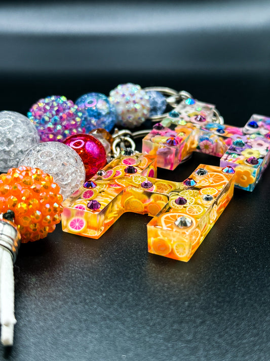 All keychains are hand‑poured epoxy resin, topped with crystals, and include a color‑complimenting tassel. All styles offer A–Z letter variants so you can personalize your charm.